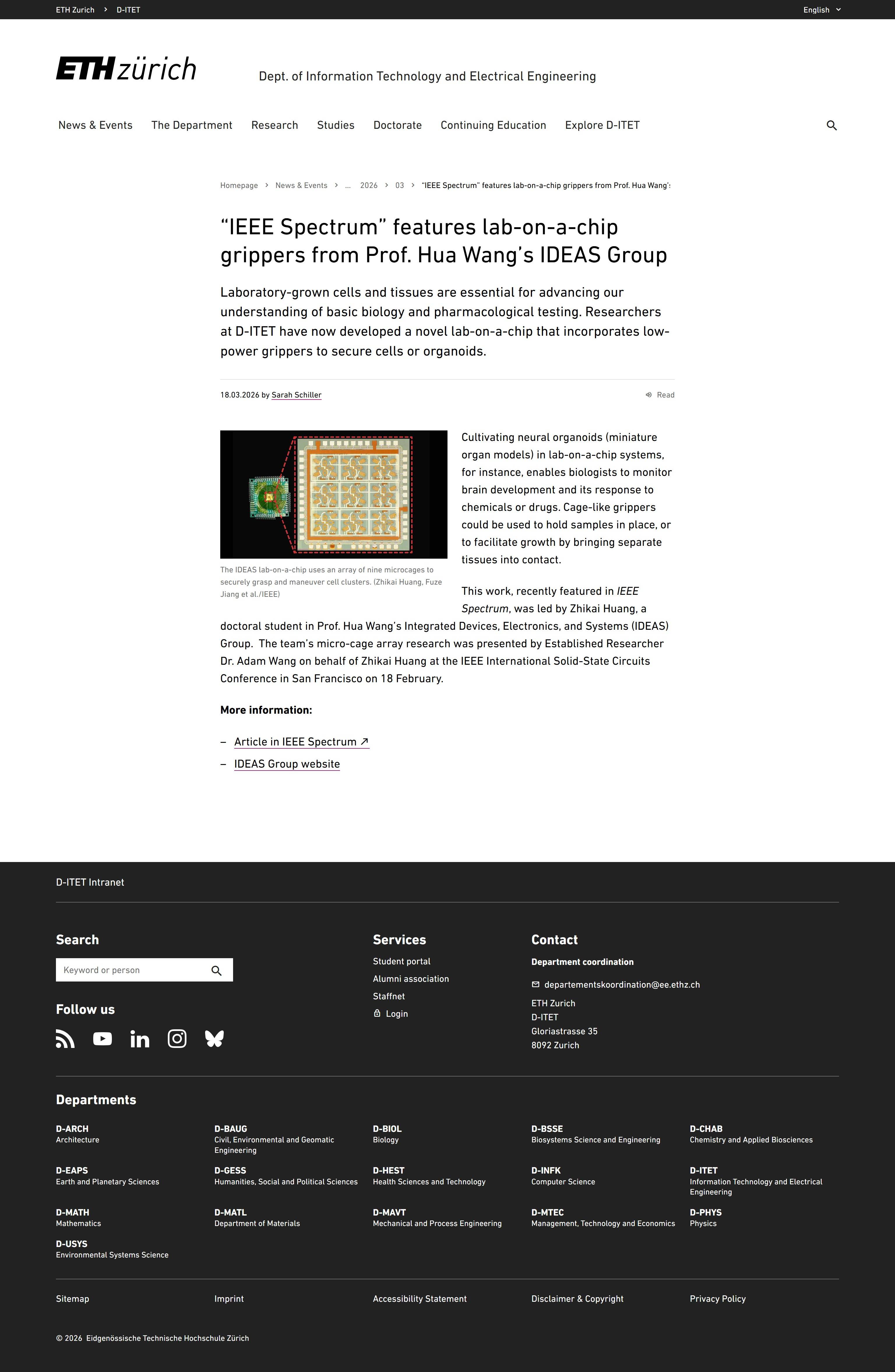 - [2] ETH Zurich, “IEEE Spectrum Features Lab-on-a-Chip Grippers From Prof. Hua Wang’s IDEAS Group,” D-ITET News Channel, Mar. 18, 2026. [Screenshot].
